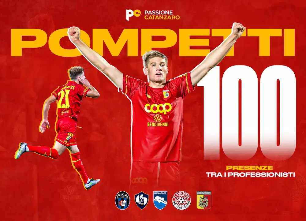 E sono 100 per Marco Pompetti! 100 presenze tra i professionisti (2 Pisa, 23 Cavese, 31 Pescara, 17 Sudtirol e 27 Catanzaro) per il giovane centrocampista del Catanzaro che, nonostante la giovanissima età, vanta già un curriculum di assoluto rispetto e che raggiunge un primo traguardo di gettoni tra i professionisti. Un cerchio che si era aperto a Pisa, quando Marco esordì tra i “grandi” in serie B a gennaio 2020, e che si chiude a Pisa dove il Catanzaro ha giocato questa sera e con cui Marco, scendendo in campo, ha raggiunto quota 100. Naturalmente questo è solo un primo traguardo per Pompetti in una carriera che ha già acquisito un gran bagaglio ma mira ad obiettivi sempre più grandi. Marco sta dimostrando, nonostante la giovane età, di essere un giocatore già fatto, pronto, esperto, bravo in entrambe le fasi di gioco con personalità e carattere da vendere. Oggi sono 100 volte Pompetti tra i professionisti, cosa sarà domani ancora non lo sappiamo ma siamo certi che l’avvenire è assicurato e ambisce a grandi successi. Ad Maiora, Marco!