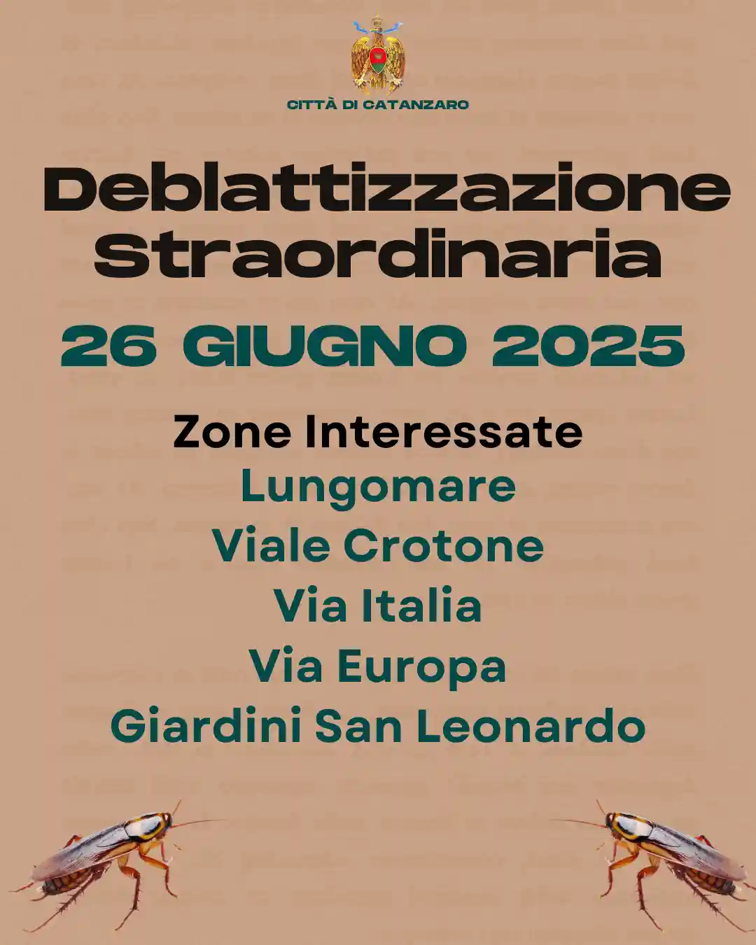 Il Comune di Catanzaro informa i cittadini che da oggi prende il via un programma straordinario di interventi di deblattizzazione nelle principali aree turistiche della città, finalizzato a garantire igiene, salubrità e decoro urbano durante il periodo estivo.
