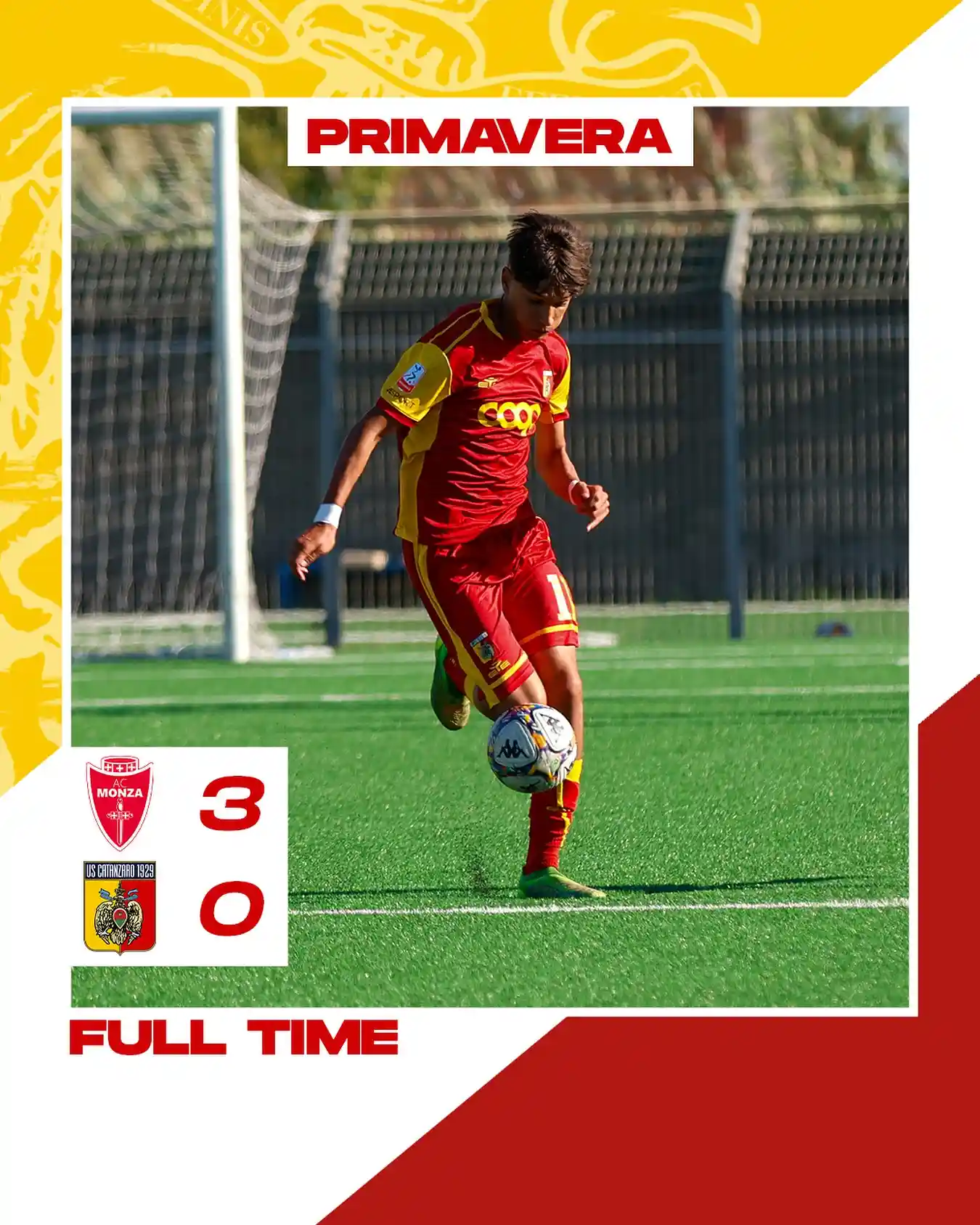 La corsa del Catanzaro Primavera in Coppa Italia si è interrotta questa mattina al Centro Sportivo “Silvio e Luigi Berlusconi” di Monza, dove i giallorossi hanno ceduto 3-0 ai brianzoli nei trentaduesimi di finale della competizione. Un risultato che racconta solo in parte l’andamento di una gara condizionata in modo determinante dall’espulsione di Ostili al 30′ del primo tempo, episodio che ha spezzato l’equilibrio e costretto la squadra di Massimo Costantino a giocare oltre un’ora in inferiorità numerica. Il divario tecnico tra Primavera 1 e Primavera 2 si è fatto sentire, ma le Aquile hanno lottato con orgoglio prima di arrendersi nella ripresa ai colpi di Azarovs e compagni.