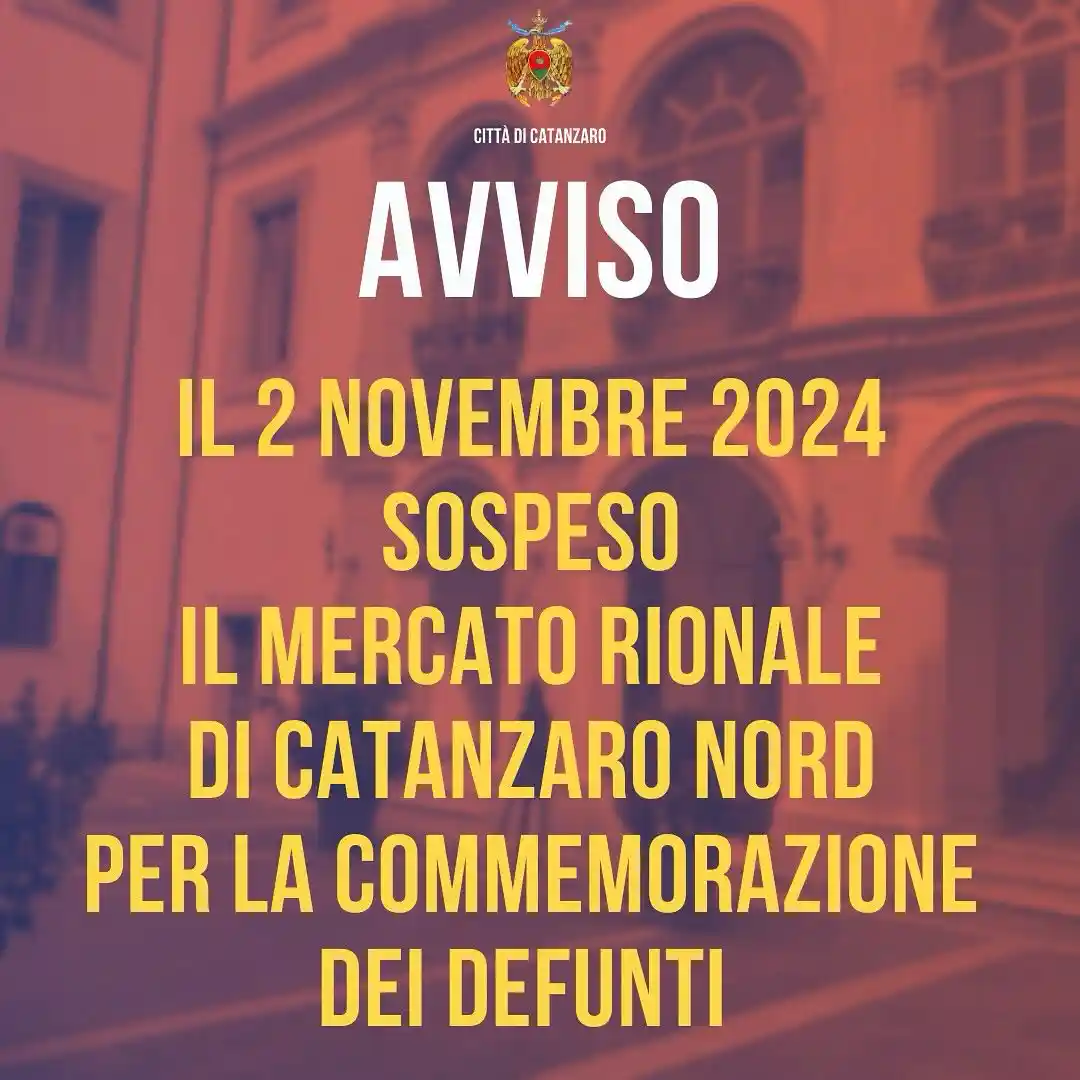 In occasione del 2 novembre, l’afflusso delle persone che rendono visita ai propri defunti subisce un considerevole aumento “tanto da rendere necessari – si legge nell’ordinanza – interventi mirati per garantire quanto più possibile una fluida circolazione stradale di mezzi pubblici e privati individuando, per questi ultimi, appositi spazi per consentirne la sosta. Queste circostanze non consentono il regolare svolgimento del mercato settimanale di Catanzaro Nord poiché è necessario evitare il verificarsi di disagi e assicurare la pubblica incolumità”.