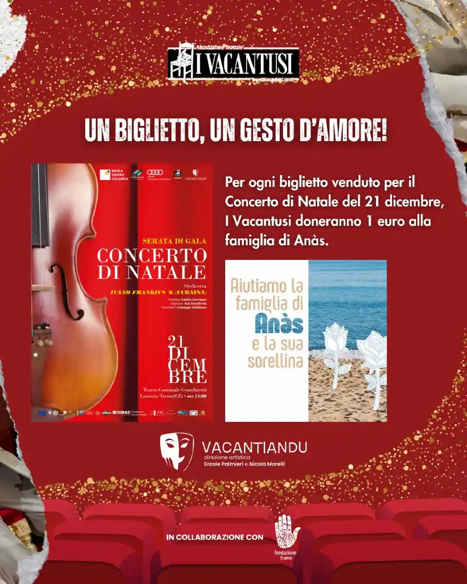 Una serata che sarà anche all’insegna della solidarietà. Un biglietto, un gesto d’amore: per ogni biglietto venduto per il concerto di Natale del 21 dicembre 2024 “I Vacantusi” doneranno 1 euro alla famiglia di Anàs e la sua sorellina.