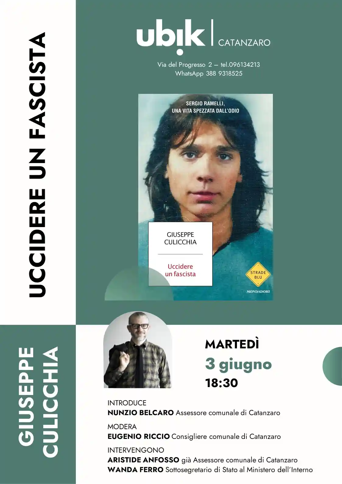 Il Consigliere Comunale di Catanzaro Eugenio Riccio annuncia che martedì 3 giugno 2025, alle ore 18.00, presso la Libreria Ubik nel quartiere Lido di Catanzaro, si terrà la presentazione del libro “Uccidere un fascista. Sergio Ramelli, una vita spezzata dall’odio” (Mondadori), ultimo lavoro dello scrittore Giuseppe Culicchia.