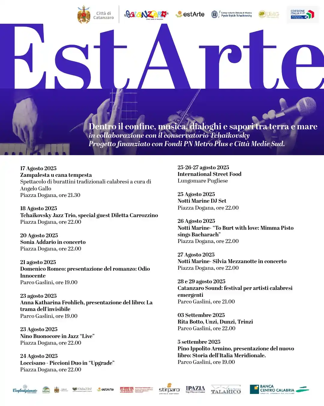 “Dentro il confine: musica, dialoghi e sapori tra terra e mare” è un festival inserito nella più ampia cornice di EstArte (qui tutti gli eventi di agosto), la rassegna di eventi programmata per l’estate 2025 dall’Amministrazione comunale di Catanzaro, mettendo a frutto l’idea di condivisione delle partnership tra pubblico e privato, pubblico e pubblico, pubblico e associazioni che le è propria, bussola costante di orientamento nell’azione di governo della Città.
