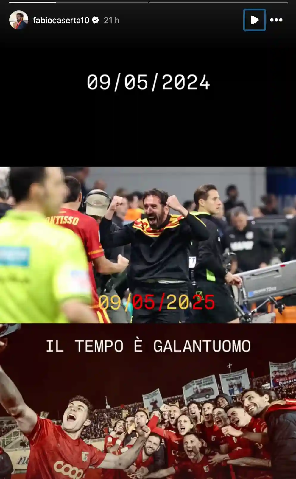 Un anno esatto. Tanto è bastato a Fabio Caserta per ribaltare il proprio destino, trasformando una data che per molti sarebbe rimasta un’ombra in un trampolino di lancio verso qualcosa di straordinario. Il tecnico del Catanzaro, attraverso una storia pubblicata sul suo profilo Instagram, ha voluto marcare simbolicamente la distanza tra due momenti che segnano con forza la traiettoria della sua carriera: 09/05/2024, giorno in cui, rimasto senza squadra dopo il difficile epilogo dell’esperienza con il Cosenza, si trovava ai margini del grande calcio, e 09/05/2025, giorno della vittoria con il Catanzaro sul campo del Sassuolo, che ha sancito l’accesso ai playoff di Serie B.