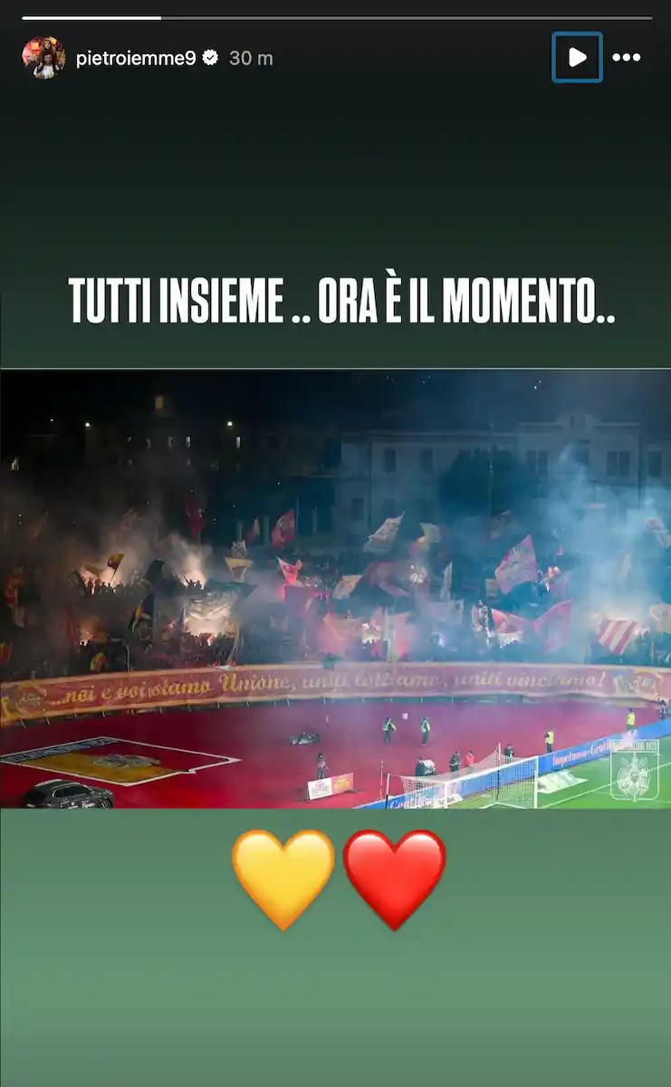 Nel momento in cui ogni dettaglio conta, ogni gesto pesa e ogni parola vibra tra le corde dell’attesa, è arrivato il segnale del capitano. Pietro Iemmello ha scelto le sue storie Instagram per lanciare un messaggio chiaro, semplice, ma carico di significato: «Tutti insieme… ora è il momento». Una frase accompagnata da un’immagine eloquente: il “Ceravolo” vestito a festa, illuminato da torce e fumogeni, con la curva Ovest pronta a ruggire ancora.