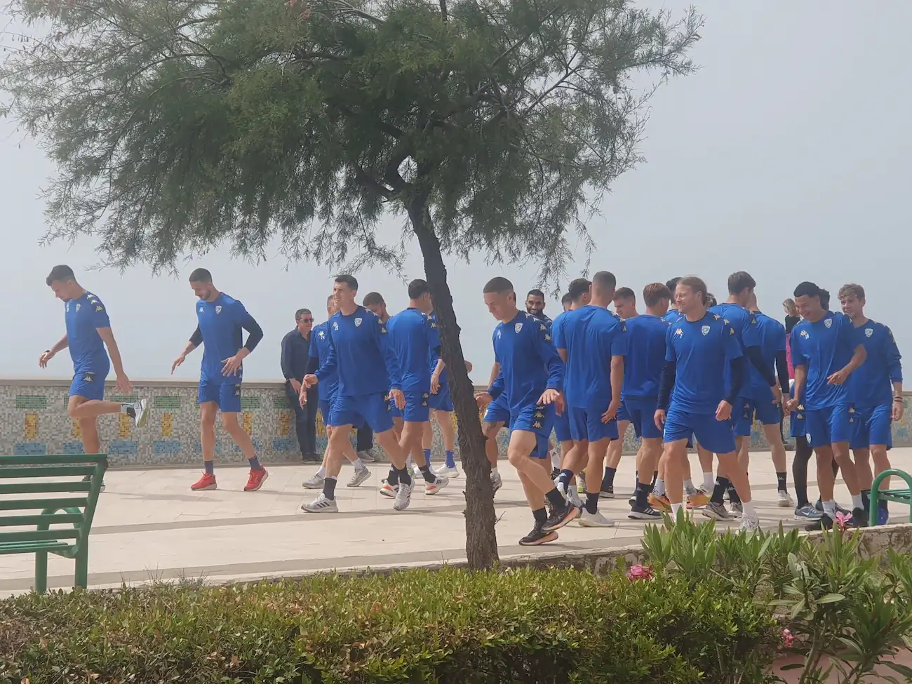 Ormai era diventata una consuetudine vedere le squadre ospiti, in ritiro nel quartiere marina, a passeggio prima delle gare in pineta o in giro nel quartiere. Ma vedere un vero e proprio allenamento sul lungomare non ci era mai capitato! E invece è quanto successo poco fa, con il Brescia che sta facendo un vero e proprio allenamento sul marciapiede della nostra passeggiata marinara. Un siparietto davvero simpatico e utile a scaricare la tensione in vista della sfida in programma stasera!