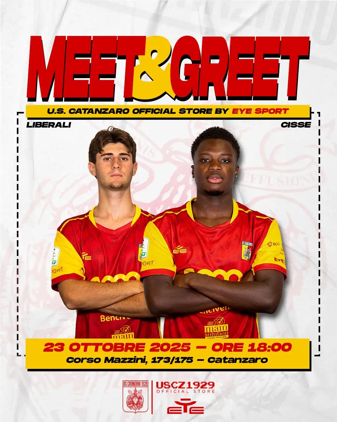 Il Catanzaro apre le porte ai propri tifosi con un appuntamento che sa di festa e di condivisione autentica. Giovedì 23 ottobre alle ore 18:00, l’US Catanzaro Official Store by Eye Sport di Corso Mazzini 173/175 ospiterà un meet & greet con due dei protagonisti di questa stagione giallorossa: Mattia Liberali e Alphadjo Cisse.