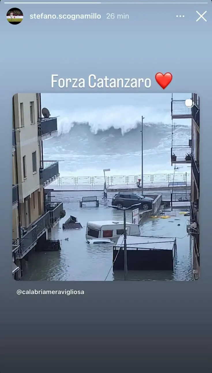 Al coro di solidarietà si è unito anche Giuseppe Ambrosino. Il giovane attaccante, che ha vestito la maglia giallorossa lasciando ottimi ricordi, non è rimasto indifferente di fronte alle immagini della devastazione. Attraverso le sue storie Instagram, il talento di proprietà del Napoli ha ripostato il video delle onde che si infrangono sul lungomare di Lido, aggiungendo un messaggio breve ma carico di significato: “Forza Catanzaro ❤️”. Un gesto che conferma, ancora una volta, come l’esperienza vissuta sui Tre Colli crei un legame affettivo che resiste al tempo e ai cambi di casacca.