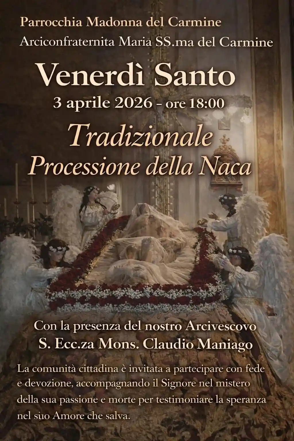 Si tratta di una tradizione antica e amatissima, capace di coinvolgere ogni anno migliaia di fedeli, famiglie, giovani e anziani che, in un clima di raccoglimento e partecipazione, accompagnano il suggestivo corteo per le vie del centro storico. La Naca – con il simulacro di Gesù Morto, adagiato sulla culla, da qui il termine Naca,addobbato con fiori e sormontata da una grande croce illuminata, portata dai vigili del fuoco e il simulacro della Vergine Maria, portata dai devoti della parrocchia – continua a parlare al cuore della città, custodendo una memoria che unisce generazioni diverse.