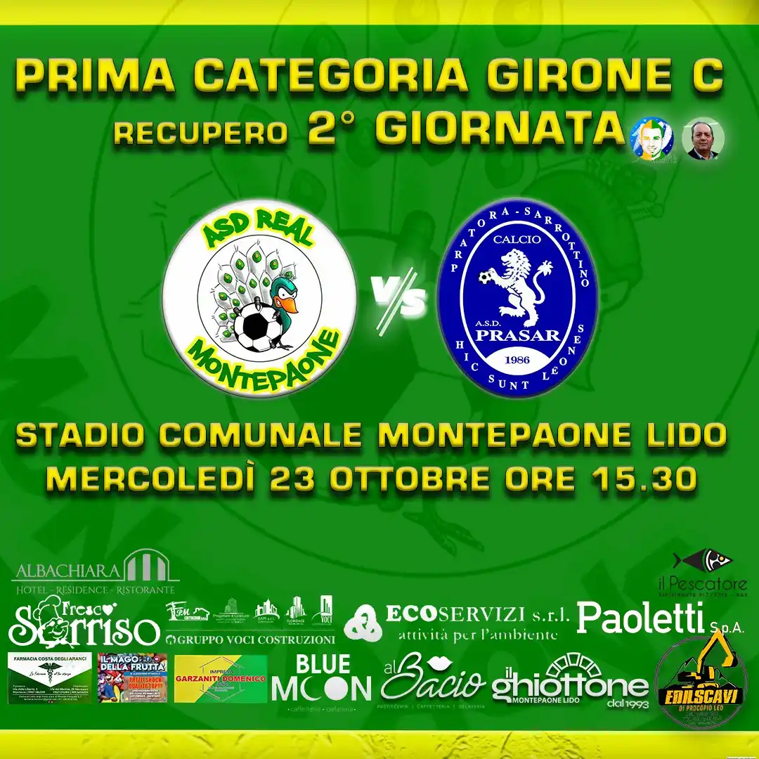 Il Real Montepaone torna subito in campo, dopo la grande vittoria di domenica, per completare la seconda giornata del campionato di Prima Categoria Girone C. Domani, mercoledì 23 ottobre, la squadra affronterà il Prasar allo stadio comunale di Montepaone Lido, con calcio d’inizio fissato per le 15:30.