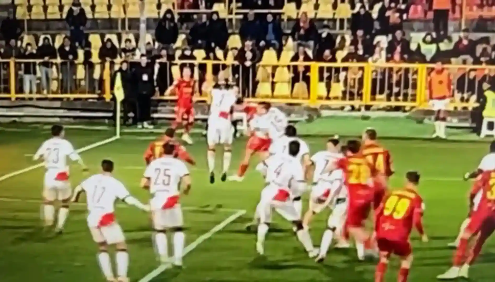 Era il 91′ minuto di Catanzaro -Reggiana e la squadra giallorossa da qualche minuto stava effettuando un forcing continuo alla ricerca almeno del gol del pari. Sul calcio d’angolo battuto dalla destra da Vandeputte, Sounas di testa “spizzica” la palla, che poi viene urtata dal difensore granata Fiamozzi e praticamente cambia nettamente traiettoria. Immediate le proteste dei calciatori giallorossi e del pubblico, e grande trepidazione di tutto lo stadio in attesa del responso del Var. Lo stesso però in pochi secondi dice all’ arbitro che non è nemmeno il caso di recarsi al monitor di bordo campo e il gioco riprende.
