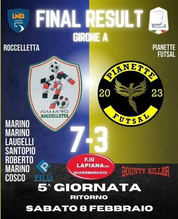 Il Roccelletta domina la 5ª giornata di ritorno del campionato di Serie C2 di futsal, imponendosi con un netto 7-3 contro il Pianette Futsal. Una prestazione di grande intensità e qualità, suggellata dalla tripletta di Cristian Marino, assoluto protagonista della sfida.