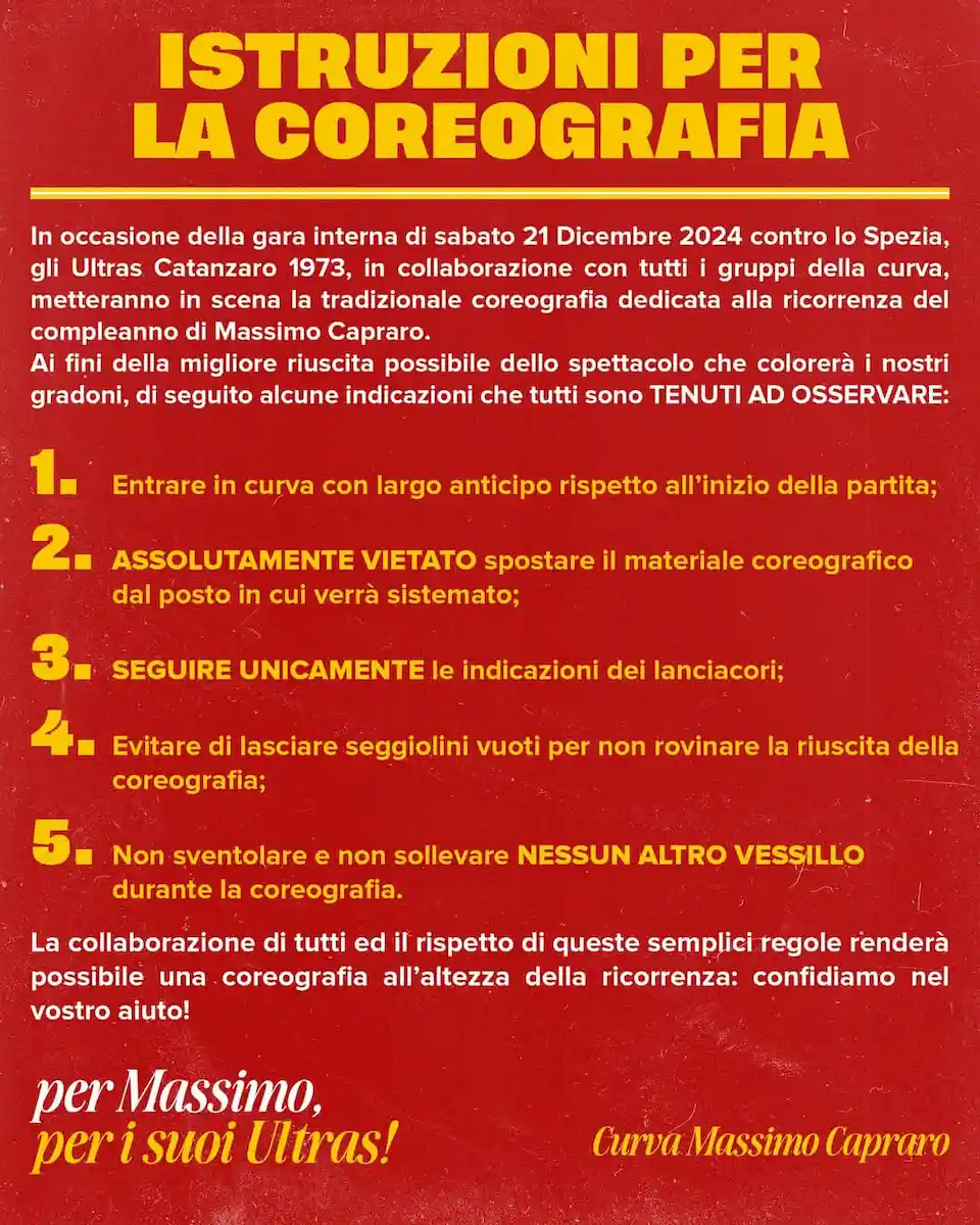 In occasione del match di sabato 21 dicembre 2024 contro lo Spezia, valevole per la diciottesima giornata di Serie B, lo Stadio Nicola Ceravolo si trasformerà in un teatro di emozioni. Gli Ultras Catanzaro 1973, con il supporto di tutti i gruppi della Curva Massimo Capraro, hanno annunciato una coreografia speciale per celebrare la ricorrenza del compleanno dello storico ultras a cui è dedicata la curva stessa.