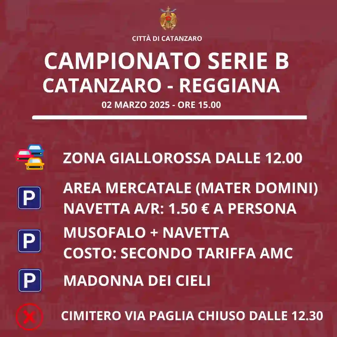 In occasione del campionato di Serie B 2024-2025, l’Amministrazione Comunale ricorda che per la partita di domenica 02 marzo 2025 tra Catanzaro e Reggiana – in programma alle ore 15.00 – sarà attiva la “Zona Giallorossa”, il piano del traffico e la possibilità di fruire dei parcheggi e trasporti pubblici per raggiungere lo Stadio Ceravolo.