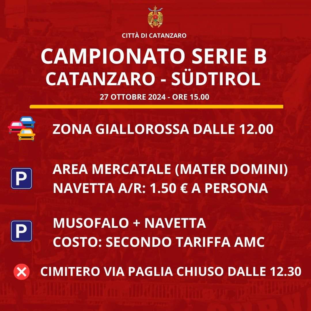 In occasione del campionato di Serie B 2024-2025, l’Amministrazione Comunale ricorda che per la partita di domani domenica 27 ottobre tra Catanzaro e Südtirol– in programma alle ore 15 – sarà attiva la “Zona Giallorossa”, il piano del traffico e la possibilità di fruire dei parcheggi e trasporti pubblici per raggiungere lo Stadio Ceravolo. Il presidente della Prima Commissione Gregorio Buccolieri sottolinea che saranno fruibili le due grandi aree parcheggio: Area Mercatale nel quartiere Mater Domini e il parcheggio “Musofalo”, con nuovo capolinea in via Schiavi. Per il parcheggio nell’Area Mercatale i posti disponibili saranno 300. L’Amc curerà il servizio di trasporto andata/ritorno al costo di euro 1,50 a persona. Le navette avvieranno il trasporto alle 12.40. Per il Musofalo, solito parcheggio e servizio navetta con tariffa ordinaria fino alla zona a ridosso dello stadio. Disponibile anche il parcheggio dell’Azienda Ospedaliero Universitaria Renato Dulbecco in via Cortese. Al termine dell’incontro, dal punto di raccolta in via Schiavi sarà garantito il rientro ai parcheggi facilitando così il deflusso di auto e pedoni. Il sindaco con propria ordinanza ha disposto la chiusura anticipata alle ore 12.30 del cimitero urbano di Via Francesco Paglia e delle attività commerciali insistenti sul piazzale adiacente alla struttura cimiteriale. Inoltre, la Polizia locale informa che dalle ore 12 sarà previsto il divieto di sosta con zona rimozione sulle seguenti strade: Area incrocio Viale Pio X – Via Giovanni XXIII; Via Giovanni XXIII; Via Madonna Dei Cieli (tratto da Coni a Telecom); Area incrocio Via Madonna Dei Cieli – Via Monsignor Fiorentini; Via Monsignor Fiorentini; Piazzale Campo Scuola; Via Paglia (tratto da Cimitero a Stadio); Via Mottola D’amato (tratto iniziale per 100 metri); Via Schiavi.