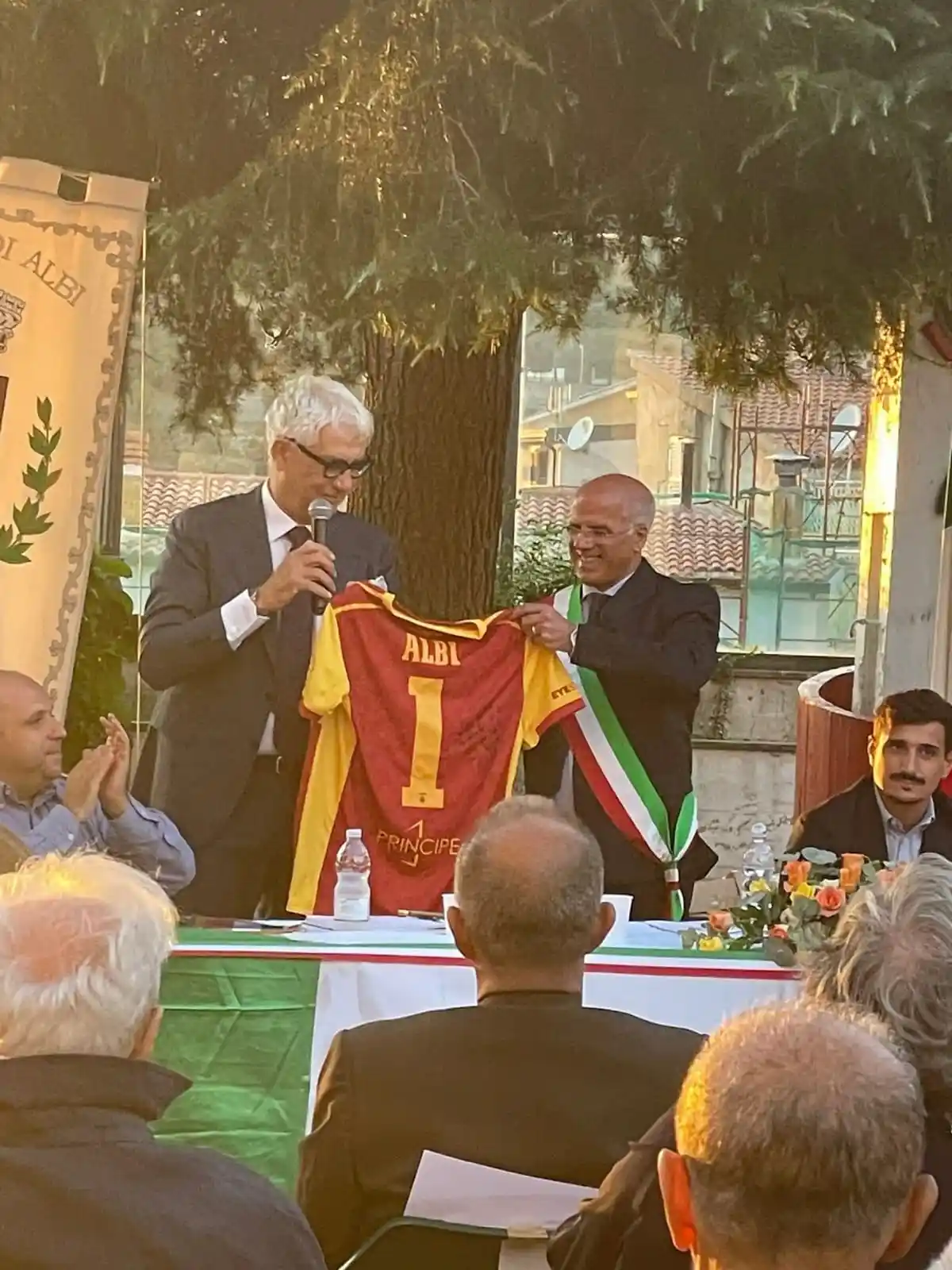 Chi conosce Albi sa che certe cose passano prima dagli sguardi e poi dai discorsi. C’era il profumo della resina dei pini che bordano la piazza, c’era una comunità raccolta intorno a uno dei suoi figli più noti, c’erano le storie di una vita che tornavano a incrociarsi con quelle del club più amato. Noto ascolta, sorride, stringe mani. La maglia giallorossa con la scritta “ALBI” è un simbolo semplice e potente: il calcio come lingua comune, la squadra come vetrina della terra. Una scelta che non nasce da un vezzo, ma da una convinzione: riconoscere chi ha dato e continua a dare – in campo e fuori – un’immagine seria e ambiziosa della Calabria.
