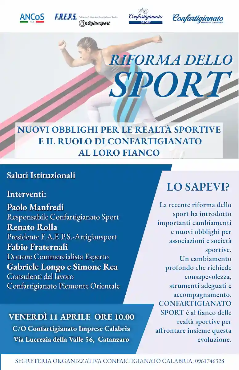 Paolo Manfredi, responsabile nazionale di Confartigianato Sport, introdurrà i lavori. «Confartigianato Sport è attiva da alcuni anni e nasce dall’esigenza di offrire supporto concreto alle imprese e alle associazioni che operano nel mondo dello sport. La normativa recente impone alle ASD e SSD un’evoluzione organizzativa significativa», sottolinea Manfredi, secondo il quale è fondamentale dotarsi di una «struttura statutaria e gestionale più ordinata e professionale, simile a quella delle imprese vere e proprie», con adempimenti che coinvolgono anche i collaboratori sportivi, «che devono essere gestiti con modalità più rigorose, all’interno di un sistema di tracciabilità e rendicontazione».