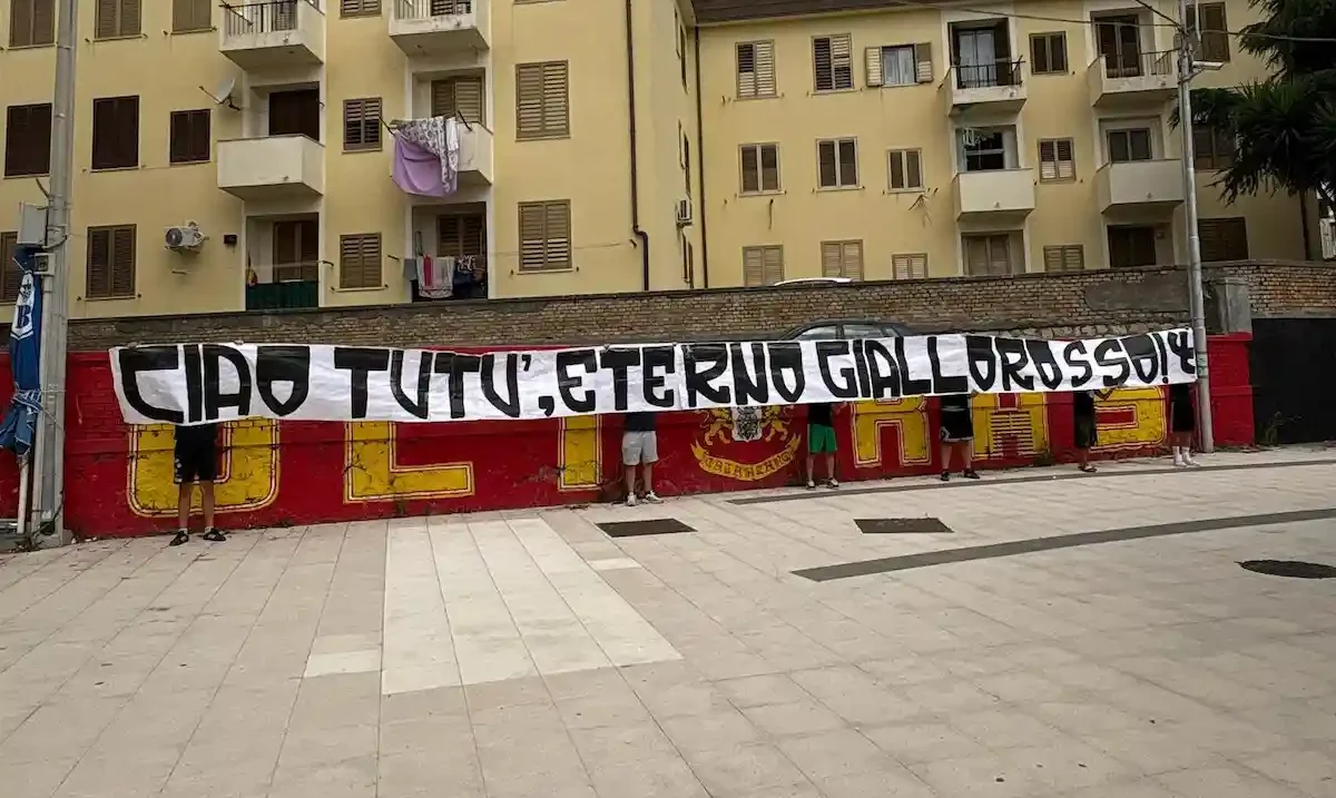 Nel cuore del quartiere che abbraccia lo stadio Nicola Ceravolo, proprio lì dove la passione giallorossa ha radici profonde e quotidiane, è apparso uno striscione che non ha bisogno di spiegazioni. Sei parole, tracciate in nero su sfondo bianco, sorrette da mani unite nella memoria: “Ciao Tutù, eterno giallorosso”. A firmarle sono gli Ultras Catanzaro 1973, la curva storica che da decenni accompagna le sorti dell’US Catanzaro 1929, e che oggi ha voluto tributare l’ultimo saluto a Salvatore “Tutù” Costa, il magazziniere che per oltre trent’anni ha vissuto il club dall’interno, con umiltà e fedeltà assoluta.