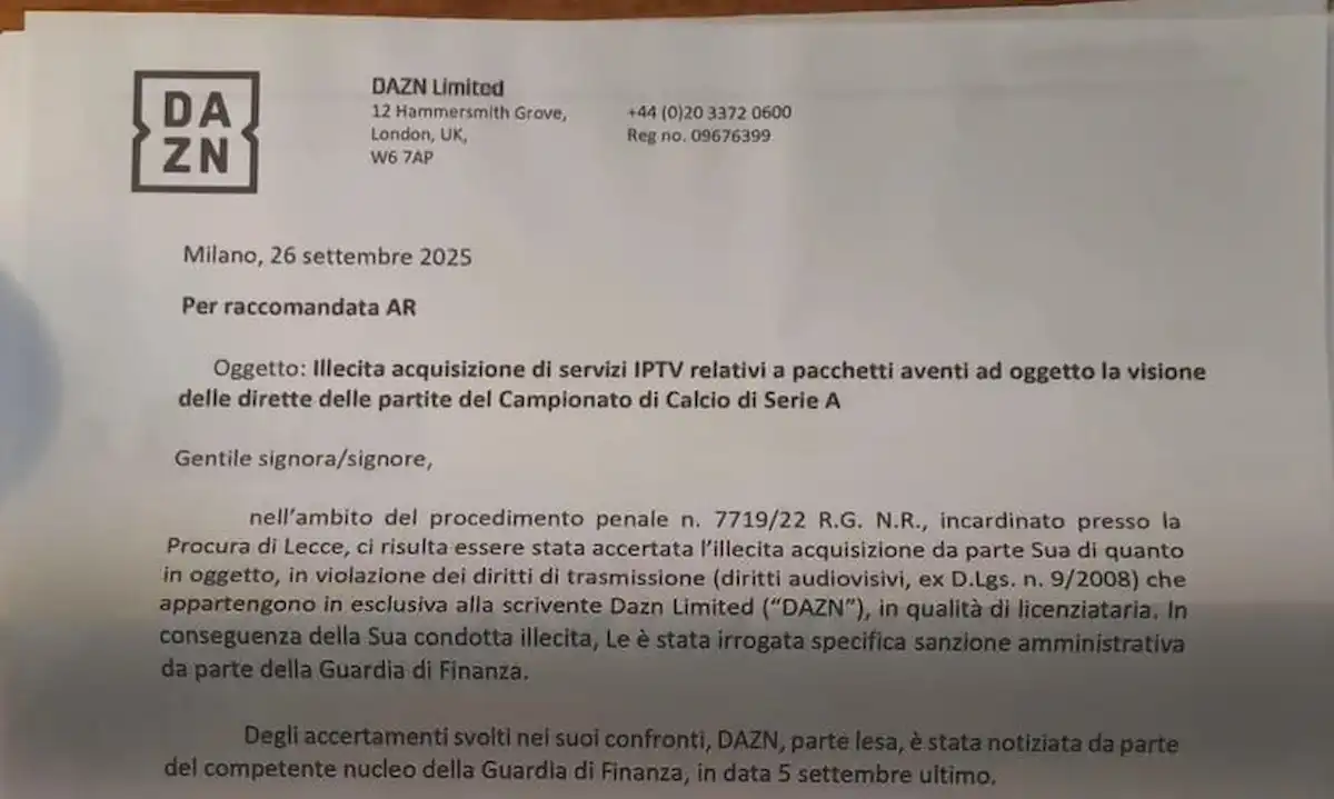 Nel testo della missiva inviata ai destinatari, Dazn scrive chiaramente: per evitare “iniziative giudiziarie di natura risarcitoria e protettive, con conseguente aggravio di costi”, la piattaforma propone il versamento di 500 euro e l’impegno formale a non ripetere l’illecito. Chi non risponde entro sette giorni rischia di trovarsi in tribunale.