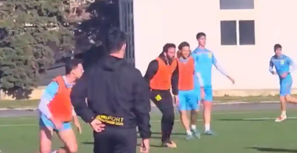 L’episodio immortalato sui social non è passato inosservato: Caserta in tuta, come tra l’altro si presenta in partita, pallone tra i piedi e movimenti che sembrano ricordare i fasti della sua carriera da giocatore.