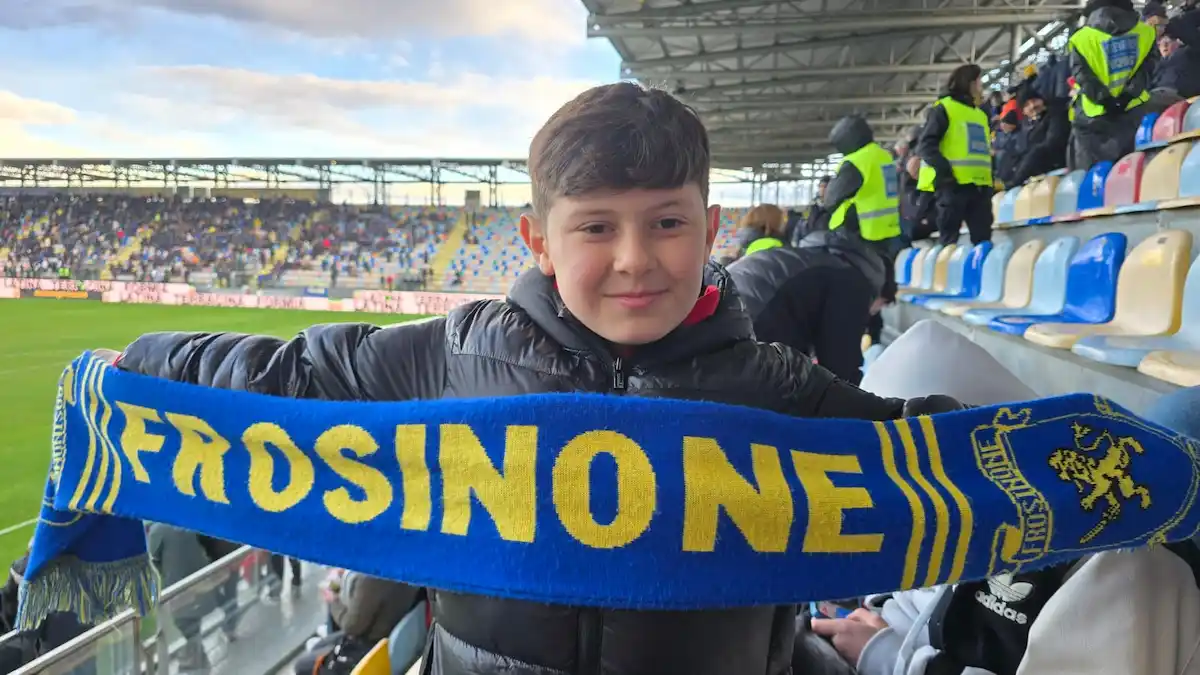Nello scatto che ci è stato inviato, il giovane tifoso posa orgoglioso mostrando la sciarpa gialloblù del Frosinone con la scritta “FROSINONE” ben visibile, simbolo di un’amicizia nata tra i seggiolini dello stadio “Benito Stirpe”.