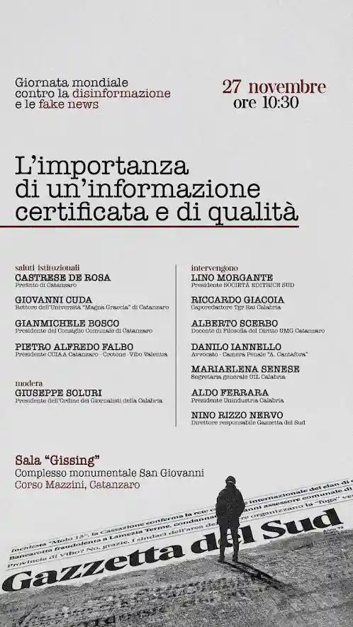 In occasione della Giornata nazionale contro la disinformazione e le fake news, il prossimo 27 novembre Gazzetta del Sud promuove a Catanzaro un incontro pubblico dal titolo “L’importanza dell’informazione certificata e di qualità”. L’iniziativa, ospitata nel Complesso monumentale San Giovanni a partire dalle ore 10:30, riunirà esponenti del mondo dell’informazione, dell’Università, delle professioni e delle istituzioni per riflettere sui rischi, le sfide e le responsabilità legati alla circolazione incontrollata di notizie false.