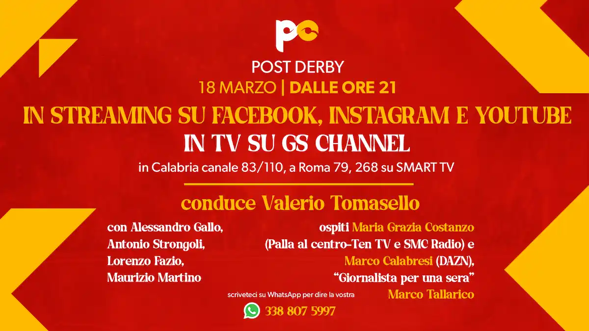 Sarà possibile seguirci a partire dalle 21 in diretta sull’emittente TV GS Channel e sui canali social Youtube, Facebook e Instagram di PassioneCatanzaro.