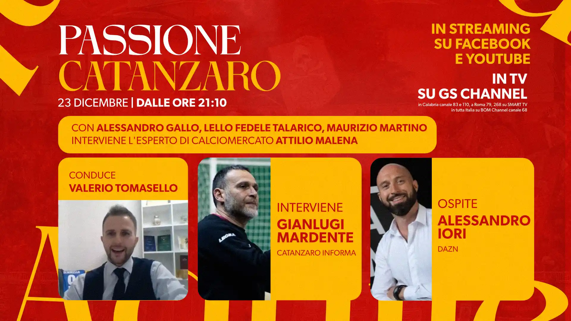 Sarà possibile seguirci a partire dalle 21.10 in diretta sull’emittente TV GS Channel visibile in Calabria sui canali 83 e 110 del DT e sui canali social Youtube e Facebook di PassioneCatanzaro.