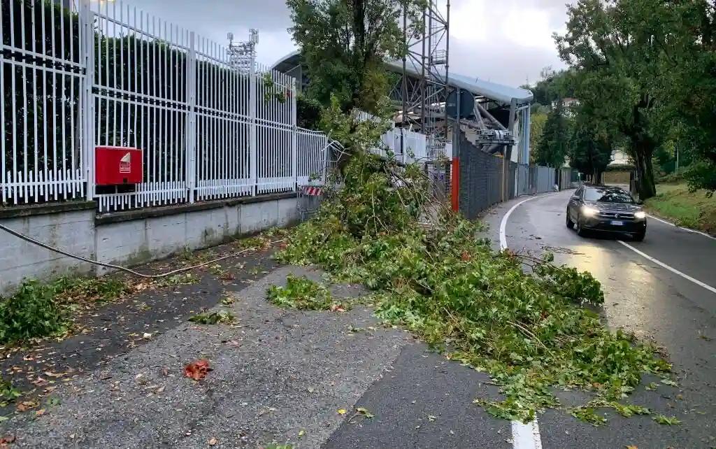 L’albero, spezzato come uno stuzzicadenti dalle raffiche, ha trascinato a terra una porzione di recinzione e messo fuori uso un punto luce in prossimità dei tornelli della tribuna. Niente episodi spettacolari, niente cronache da cataclisma: Protezione Civile e Vigili del Fuoco sono entrati subito in azione, hanno messo in sicurezza l’area, liberato la carreggiata e avviato il ripristino dei servizi. Parliamo di danni circoscritti, fastidiosi ma gestibili, che non toccano il rettangolo verde né i varchi principali.