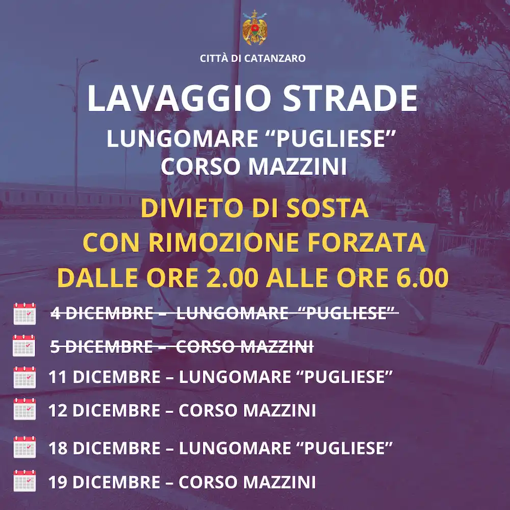 Il Comune di Catanzaro ricorda che già da una settimana è stato dato avvio ad una serie di interventi di lavaggio delle strade, che interesseranno Corso Mazzini, i vicoli limitrofi raggiungibili e il lungomare Stefano Pugliese. Gli interventi, partiti il 4 dicembre 2024 dal lungomare e proseguiti su Corso Mazzini, mirano a garantire una pulizia profonda delle strade, dei marciapiedi e delle superfici urbane, contribuendo al miglioramento del decoro cittadino e continueranno questa notte nuovamente sul lungomare Pugliese.