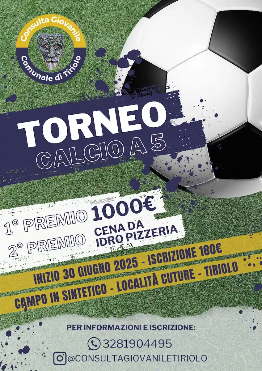 La Consulta Giovanile Comunale di Tiriolo è lieta di annunciare l’attesissimo Torneo di Calcio a 5, che avrà inizio il 30 giugno 2025 presso il campo in sintetico in località Cuture – Tiriolo. Un’occasione imperdibile per tutti gli appassionati di calcetto che vogliono mettersi alla prova in una sfida all’insegna dello sport e del divertimento.
